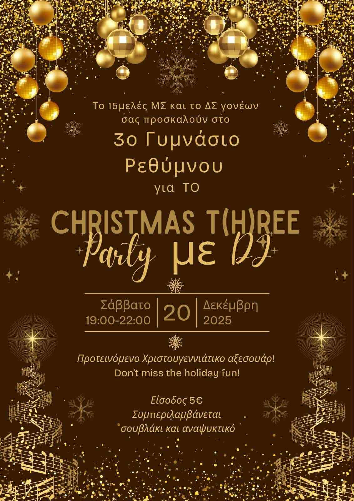 Σας προσκαλούμε το Σάββατο 20 Δεκεμβρίου στο Χριστουγεννιάτικο πάρτι που διοργανώνει το Μαθητικό Συμβούλιο και ο Σύλλογος Γονέων & Κηδεμόνων του 3ου Γυμνασίου Ρεθύμνου.