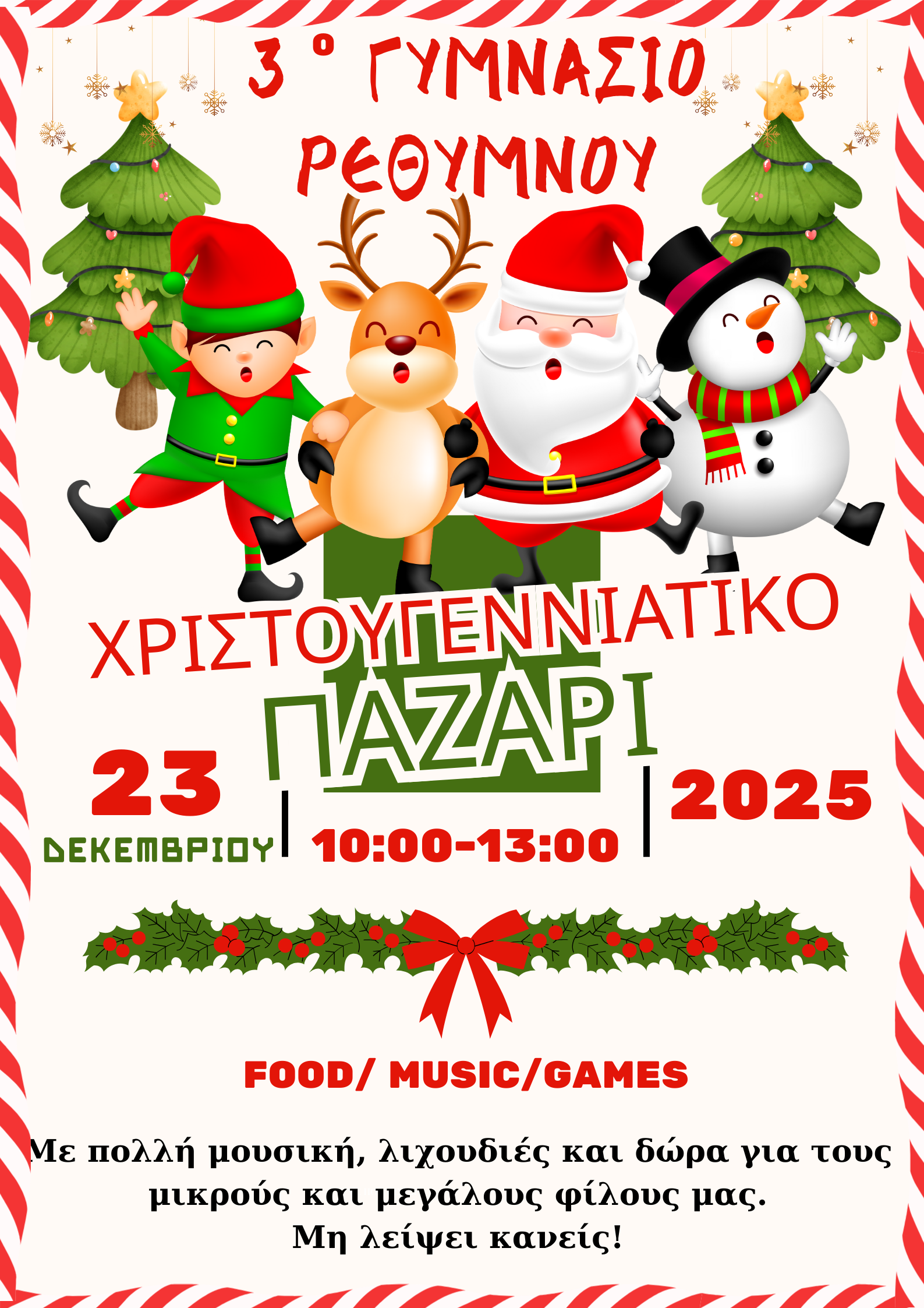 Αύριο 22/12/2025 από τις 10:00 έως 13:00 θα πραγματοποιηθεί στην αυλή του σχολείου μας Χριστουγεννιάτικο Παζάρι!